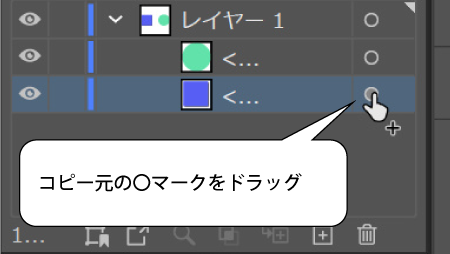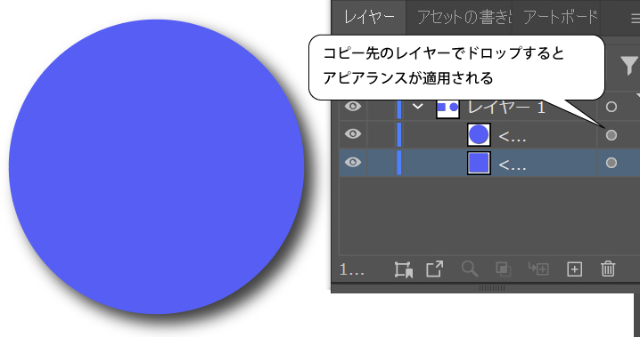 この〇マークを他のレイヤーにドラッグ&ドロップすると、アピアランスを移動させることができます。
